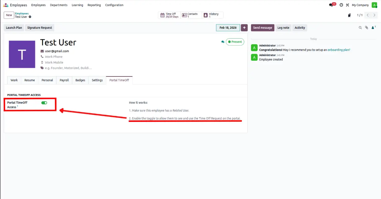HR can enable or disable portal time-off access for each employee individually via a simple toggle on the employee form.